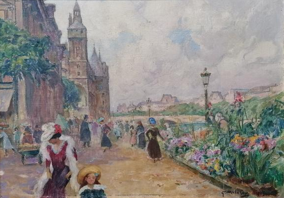 Georges Jules Moteley, Élégantes au marché aux fleurs de l’île de la Cité, quais de Seine à Paris, 1905.